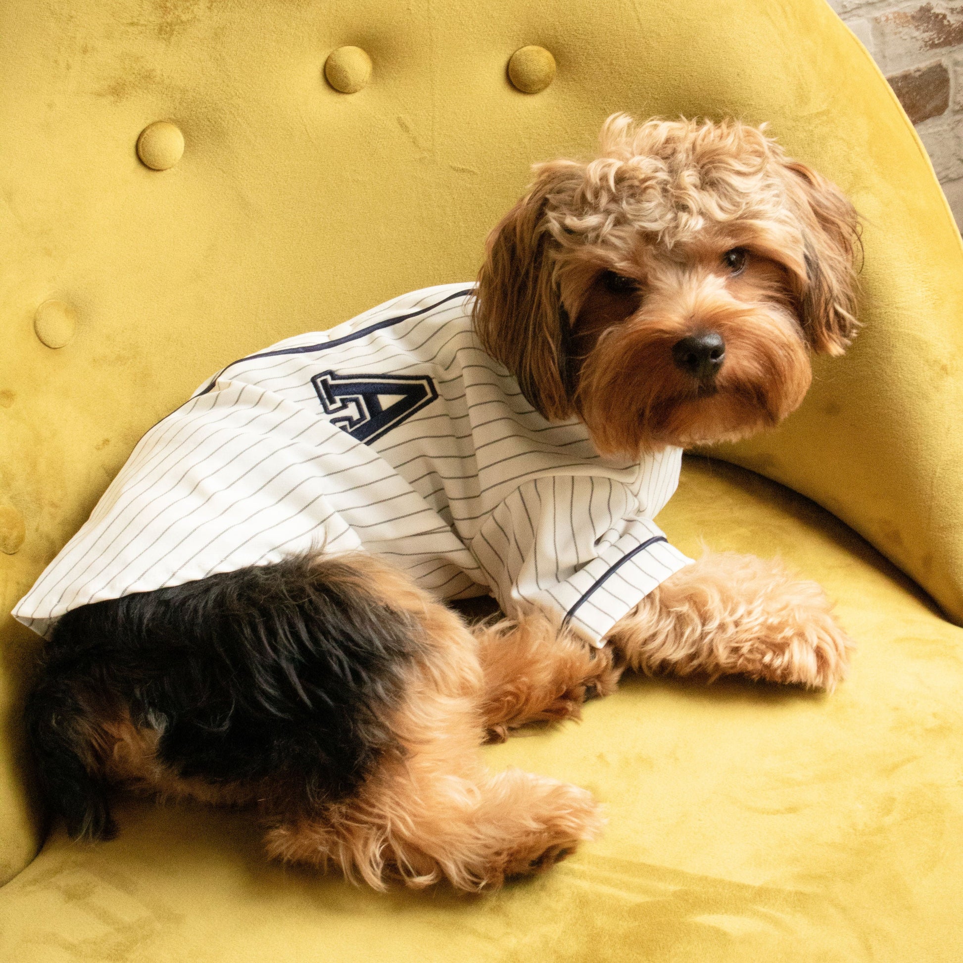 Camiseta tipo jersey con diseño deportivo y bordado de la letra A. Hecha de poliéster ligero y transpirable, ideal para paseos con estilo. Talla L: ideal para perros de 11 a 14 lb, con pecho de 46 cm y largo de espalda de 35 cm.