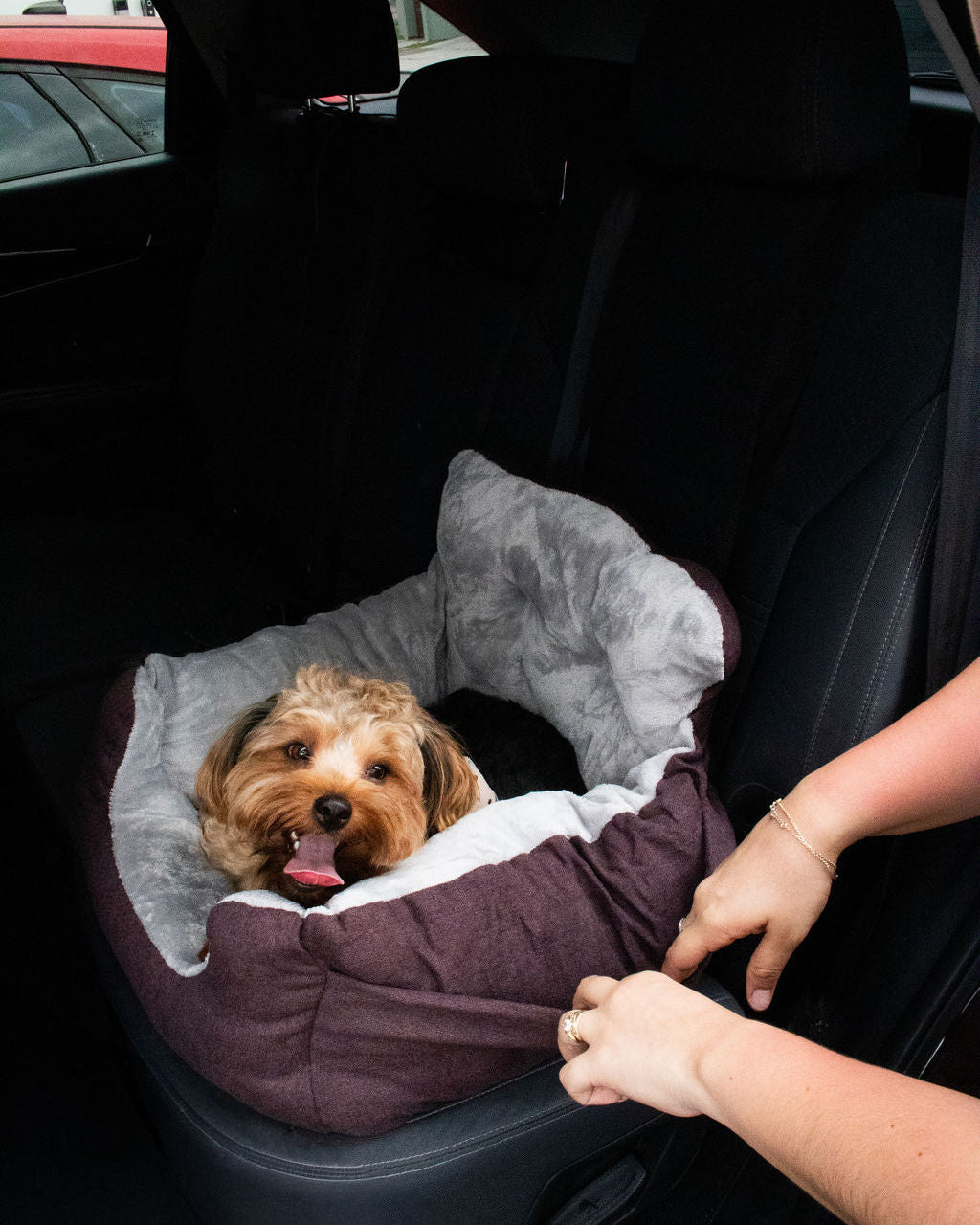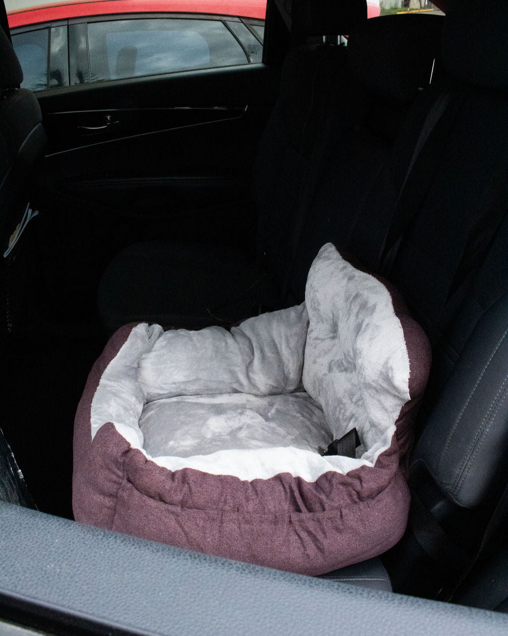 ¡Un paseo suave y seguro! Este asiento acolchonadito en tono vino con interior gris claro es ideal para que tu mascota viaje feliz.