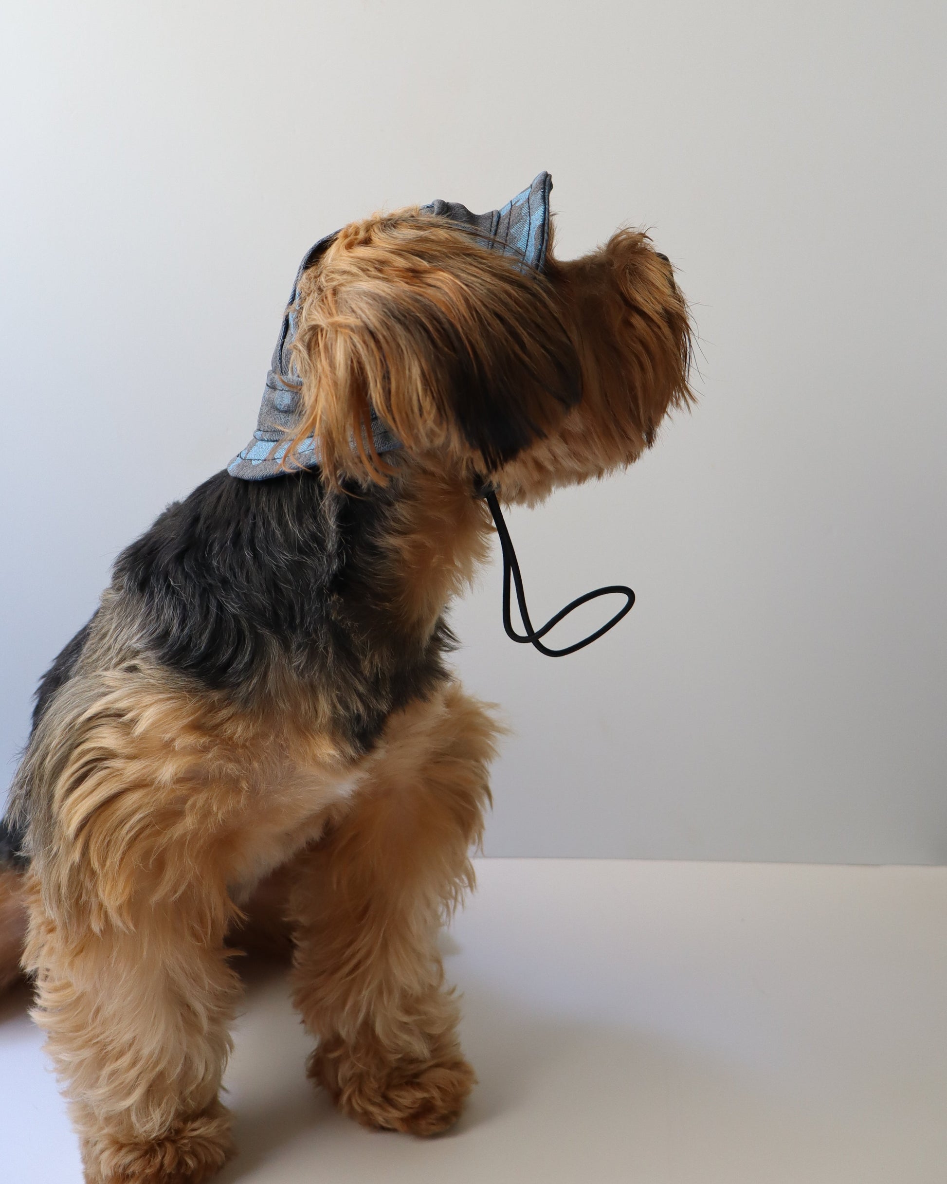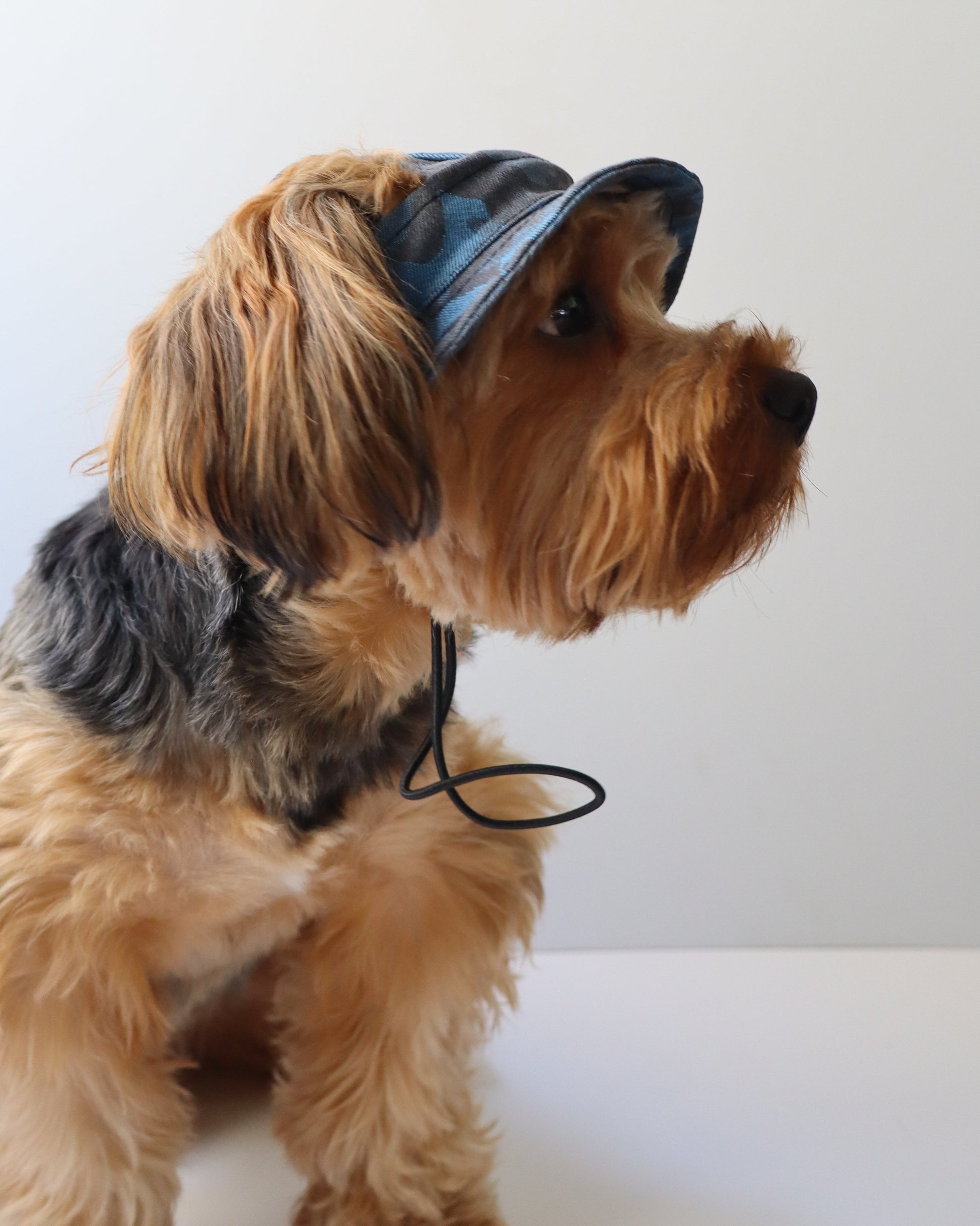 Sombrero de camuflaje azul para perros, ideal para proteger del sol durante paseos y actividades al aire libre. Tela cómoda y correa ajustable para un ajuste seguro.