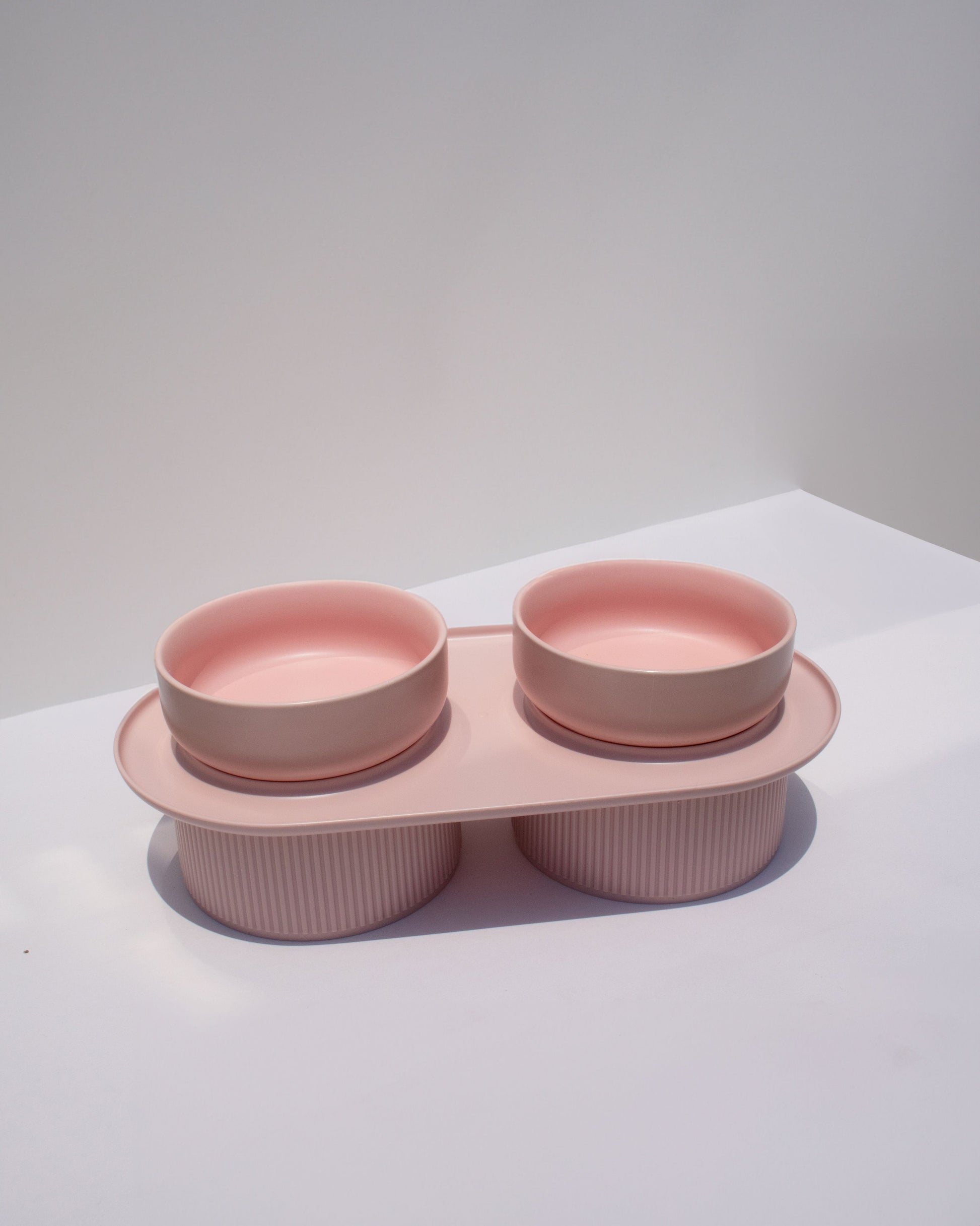 Set de comederos dobles con base elevada y estructura desmontable. Incluye dos bowls de cerámica de alta resistencia sobre plataforma plástica firme y antideslizante. Mejora la postura y evita la fatiga cervical. Fácil de desmontar y limpiar.