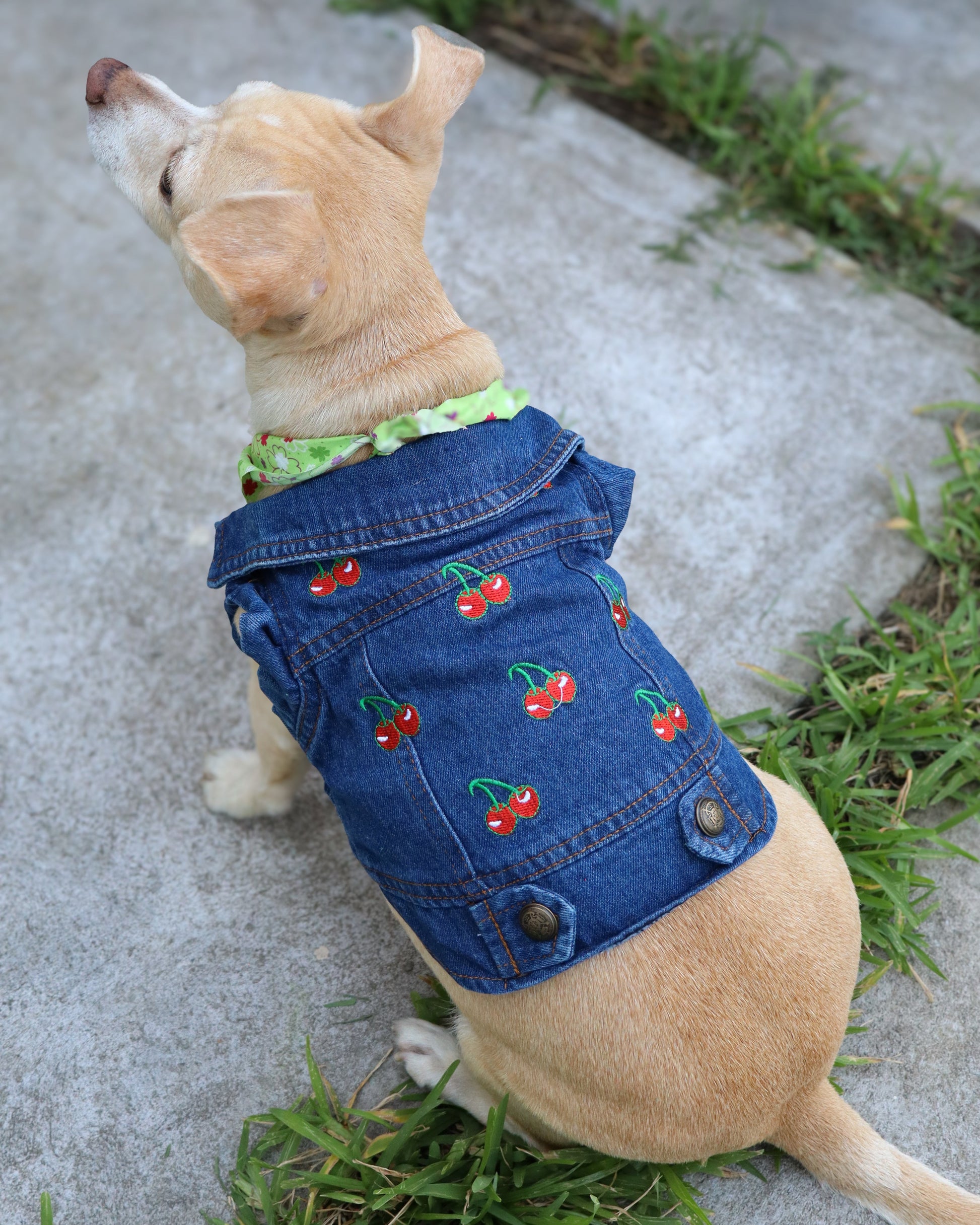 Chaleco de mezclilla para perros con bordado de cerezas. Diseño ligero y fresco ideal para verano. Con broches de presión para fácil colocación y costuras reforzadas. Perfecto para mascotas pequeñas que quieren pasear con estilo.