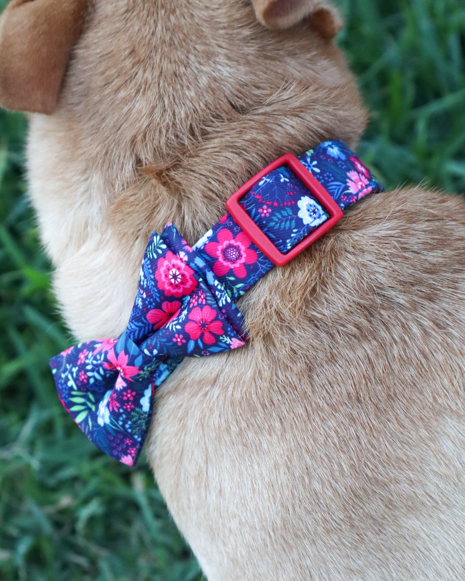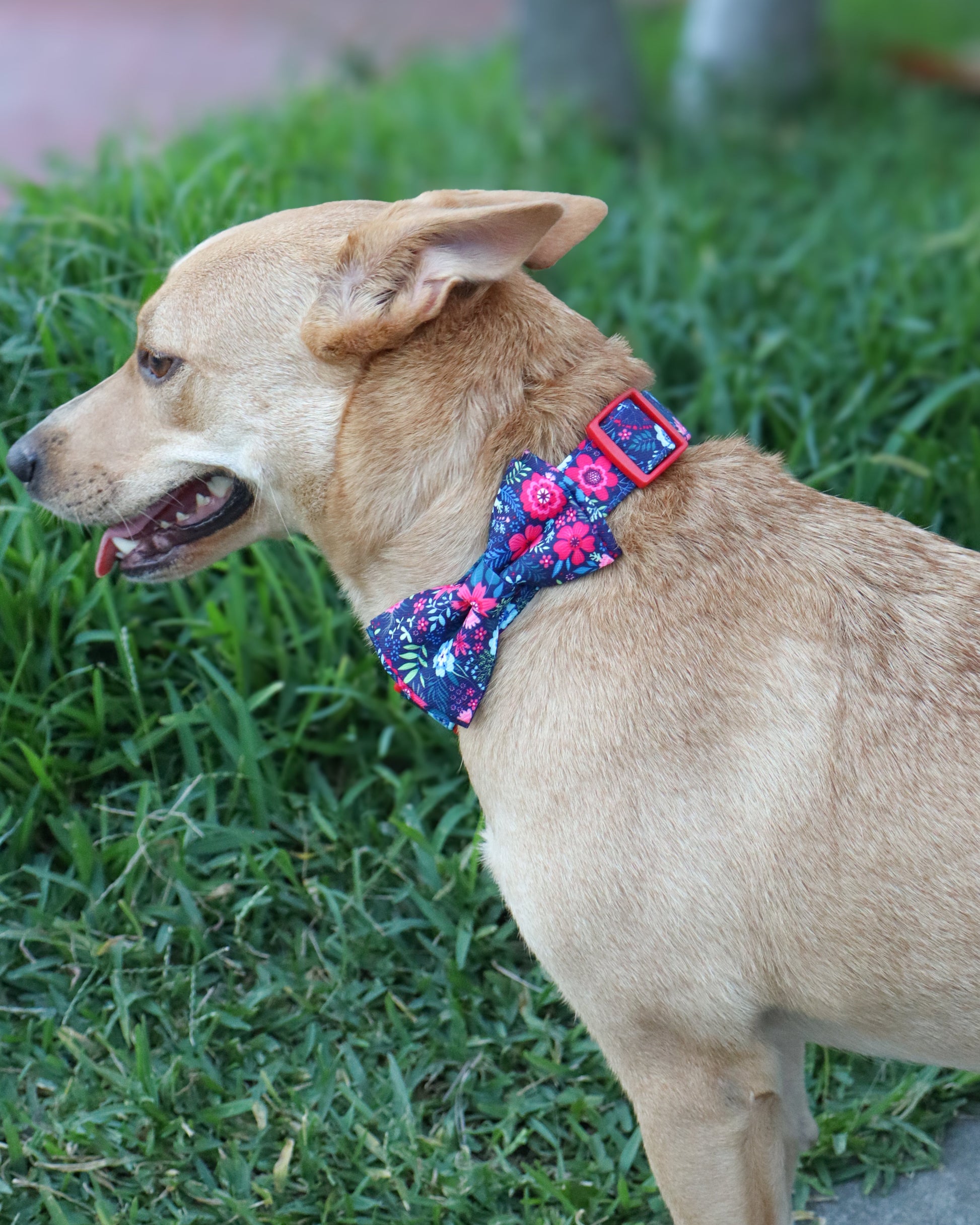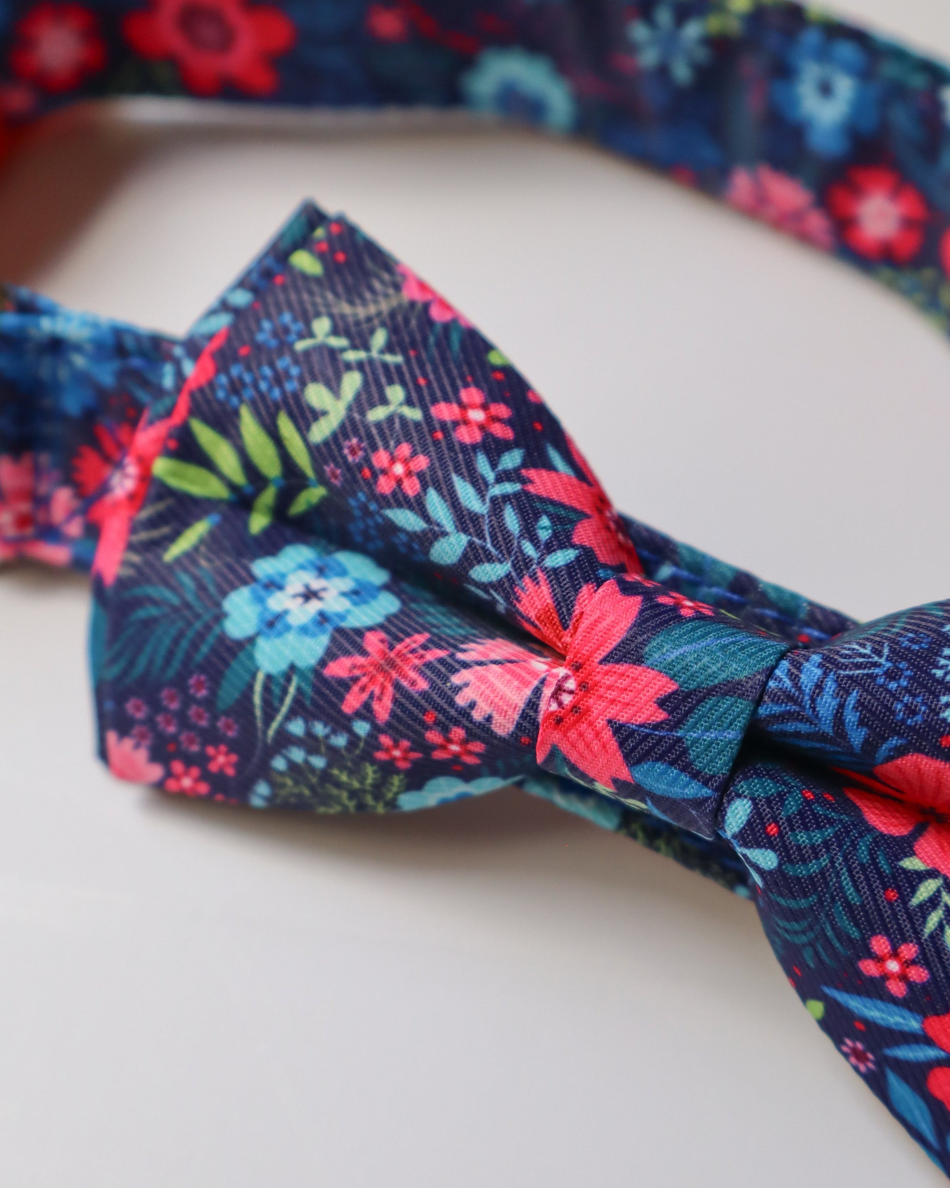 Collar ajustable con moño removible en tela de algodón con estampado floral en tonos azul, rosa y verde. Un diseño elegante y cómodo, ideal para salidas especiales o el uso diario.
