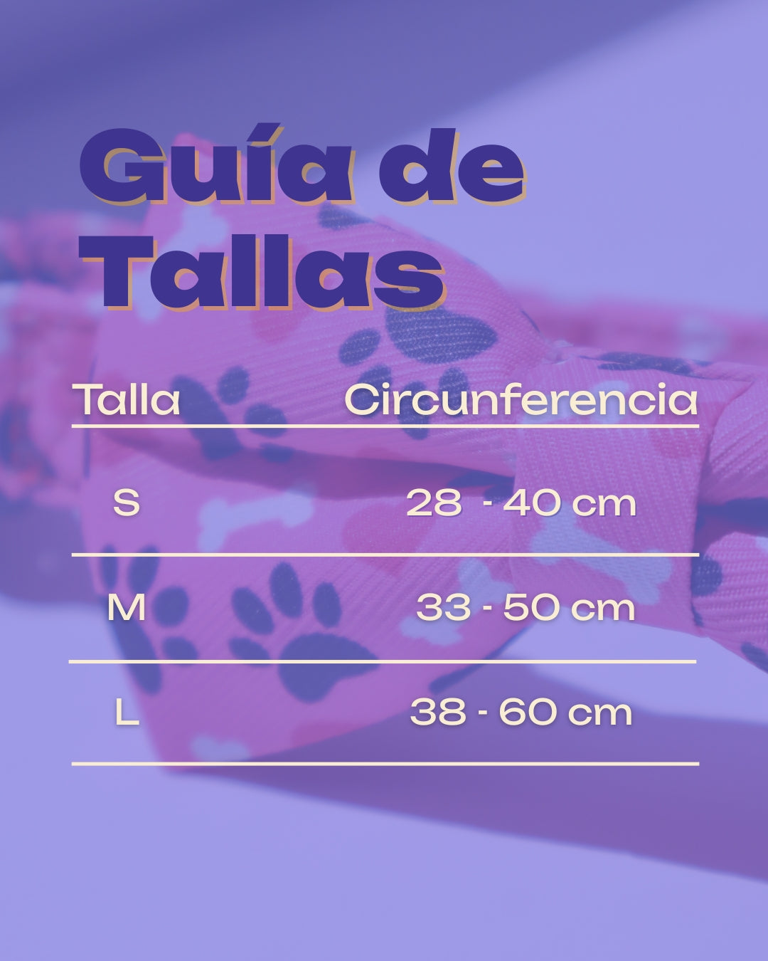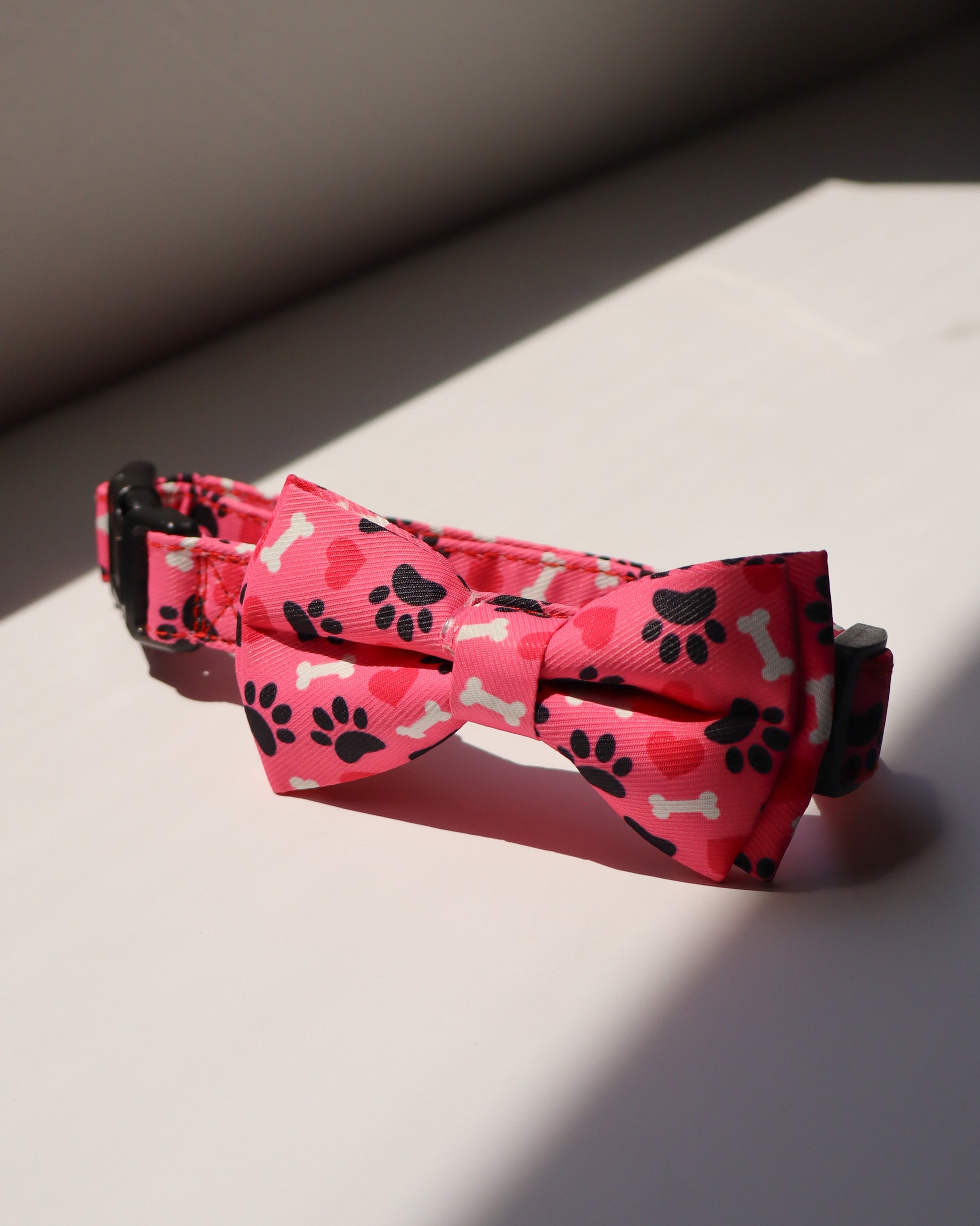 Collar en tono rosa con estampado de huellas, corazones y huesos. Incluye moño removible y cierre plástico negro. Diseño ligero y fácil de ajustar.