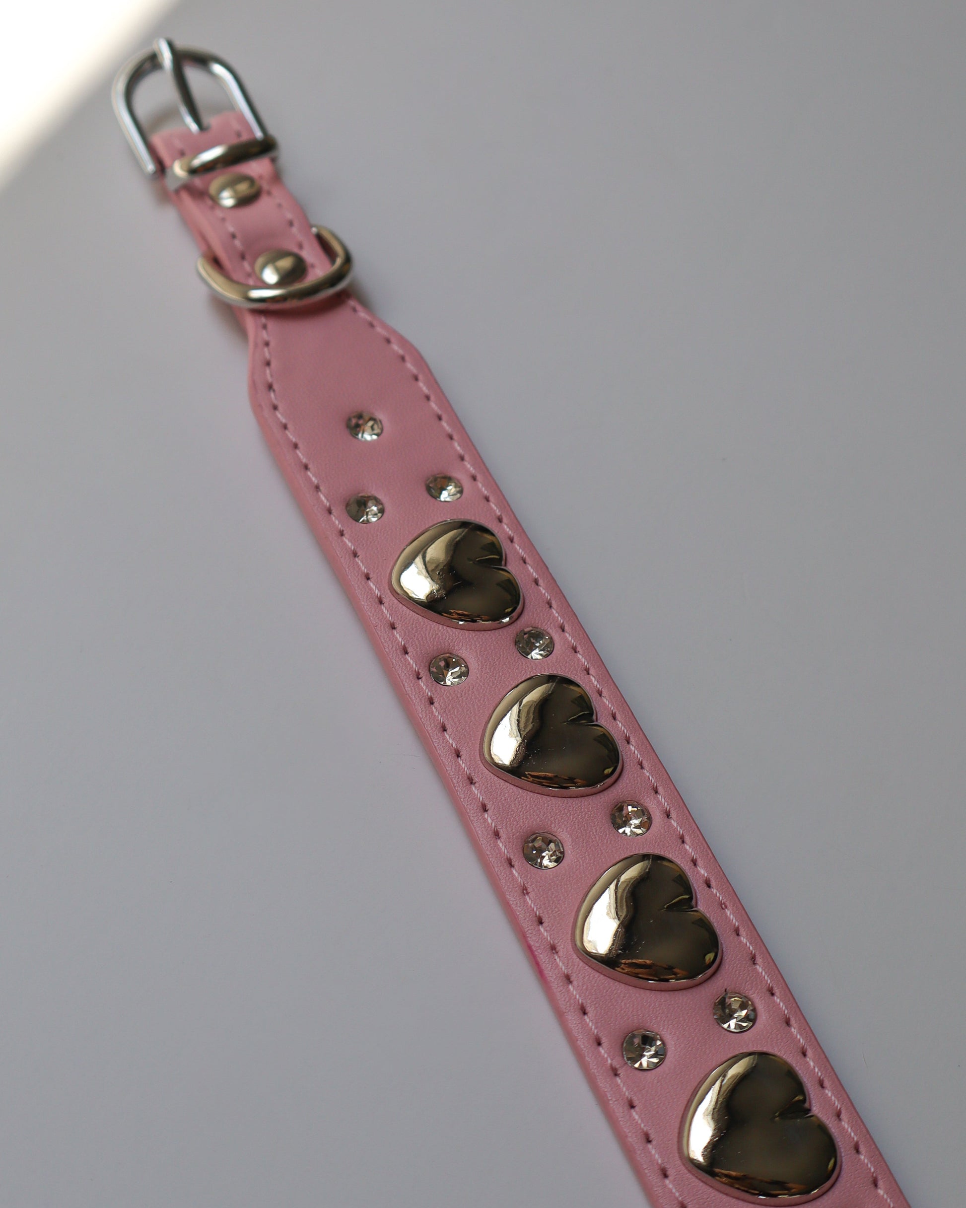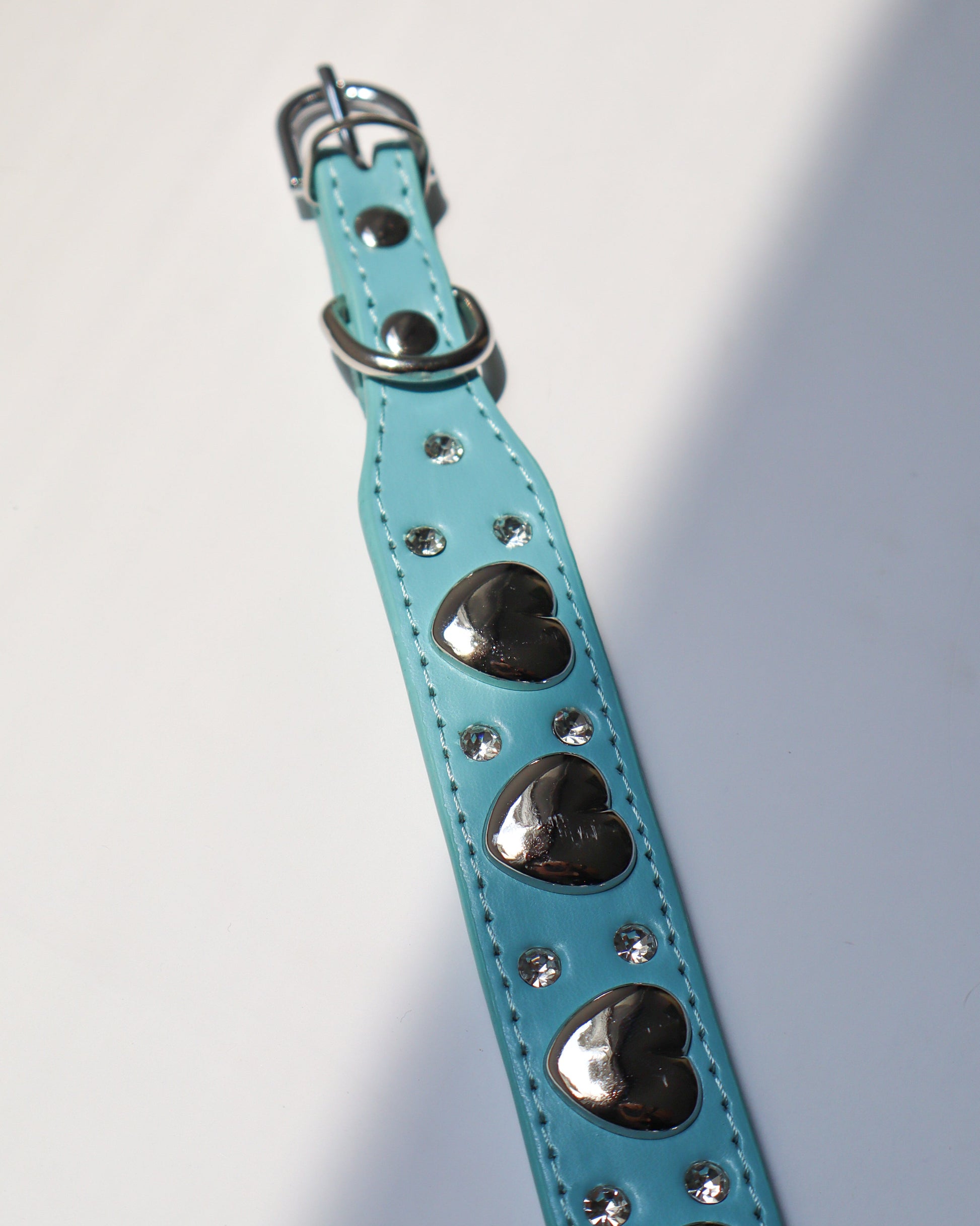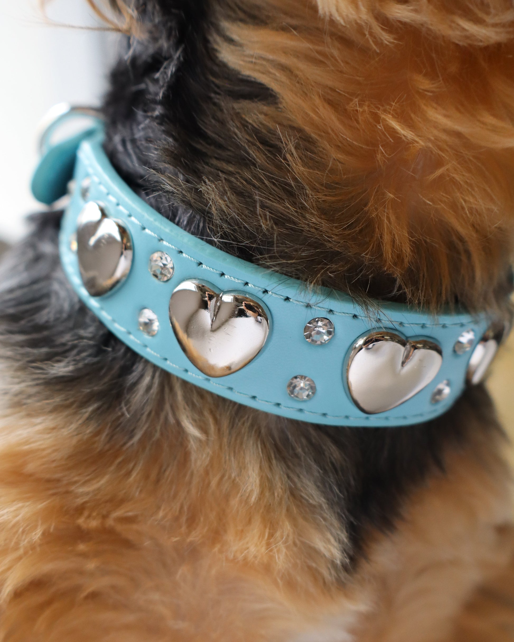 Collar azul celeste o rosado con corazones metálicos y decoraciones brillantes. Un diseño llamativo que mezcla ternura y estilo con un toque rebelde.