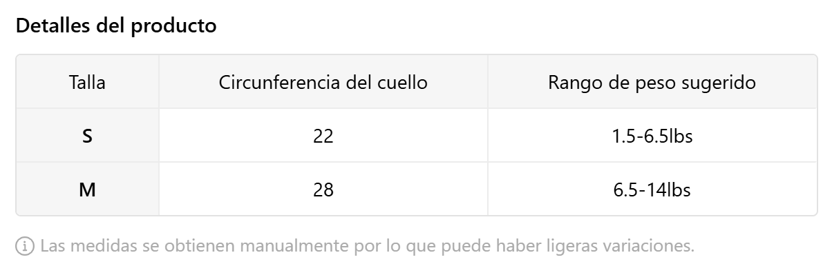 Consulta la guía de tallas en las imágenes del producto. Si tienes dudas sobre cuál elegir, ¡escríbenos y con gusto te ayudamos!🐾