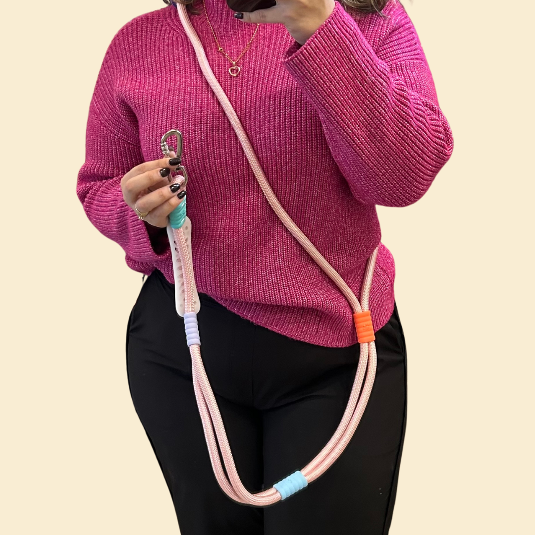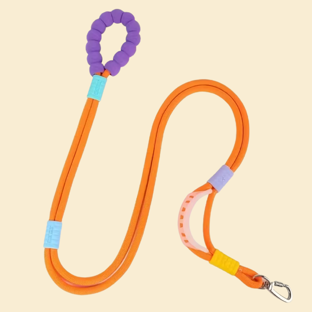 Correa de 5 pies estilo manos libres, ajustable y multifuncional. Elaborada en cuerda trenzada de alta resistencia con detalles de silicona suave para un agarre cómodo y seguro.