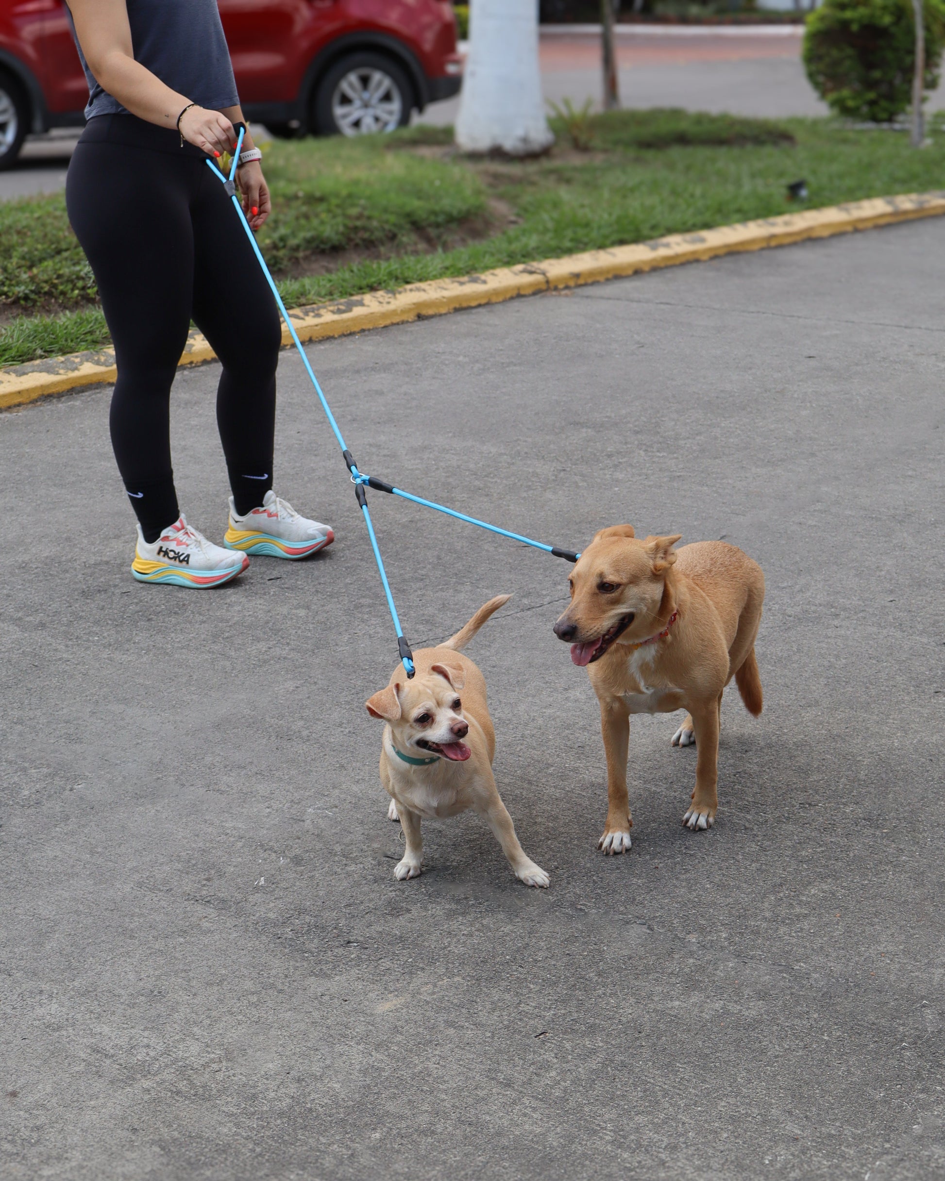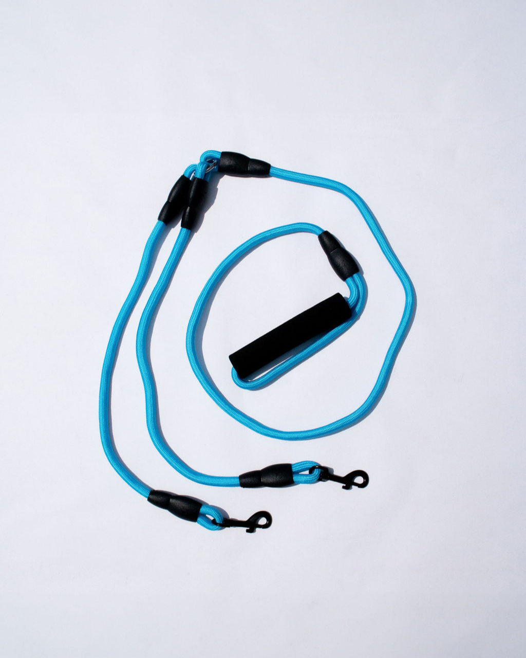 Correa doble antienredos con acopladores giratorios y mango acolchado. Fabricada en cuerda de poliamida resistente, ideal para pasear a dos perros con control y comodidad. Longitud: 5 pies.