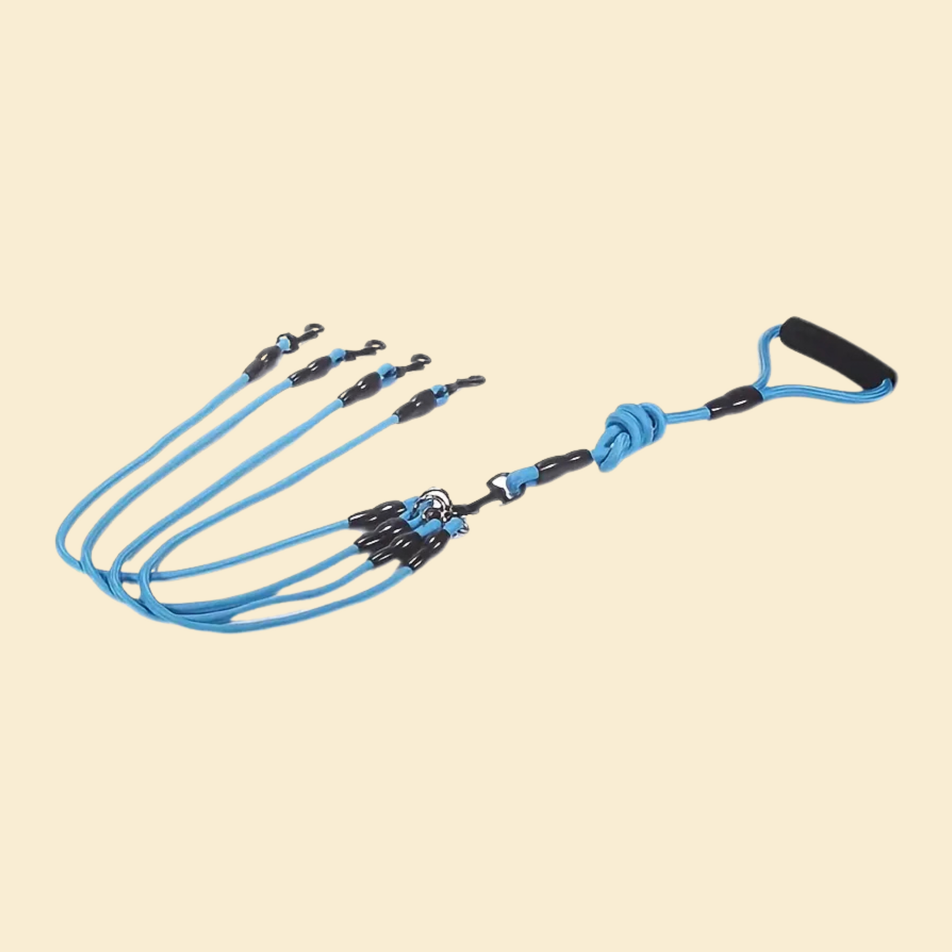 Camina hasta 4 perros a la vez con esta práctica correa multiperros. Fabricada con cuerda elástica resistente y mosquetones metálicos, incluye un mango ergonómico con espuma antideslizante para mayor comodidad. Cada ramal mide 70 cm de largo y 0.8 cm de grosor, mientras que la correa principal mide 80 cm de largo y 1.2 cm de grosor.