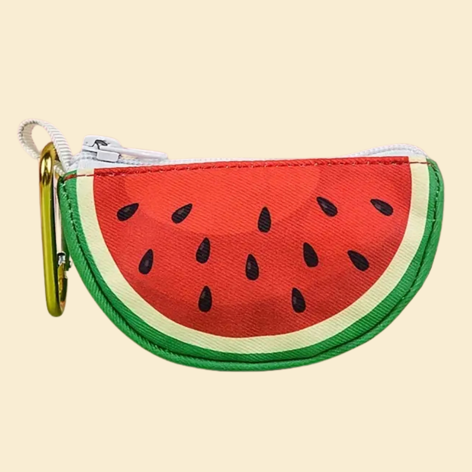 Dispensador de bolsas con diseño de fruta, fabricado en lona resistente con cierre y clip metálico. Ligero, funcional y perfecto para paseos con estilo.
