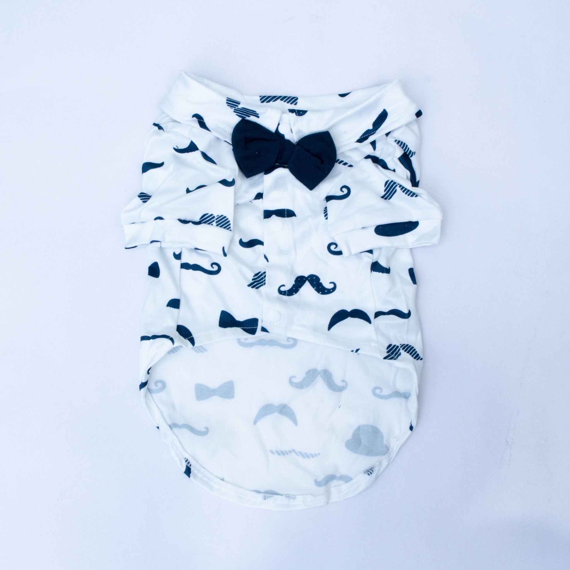 Camisa elegante para mascotas con estampado de bigotes y moño azul marino. Confeccionada en poliéster suave y ligero, ideal para ocasiones especiales. Talla M: pecho 41 cm, cuello 33 cm, largo 28 cm. Para perros de 4.4 a 6.6 lbs.