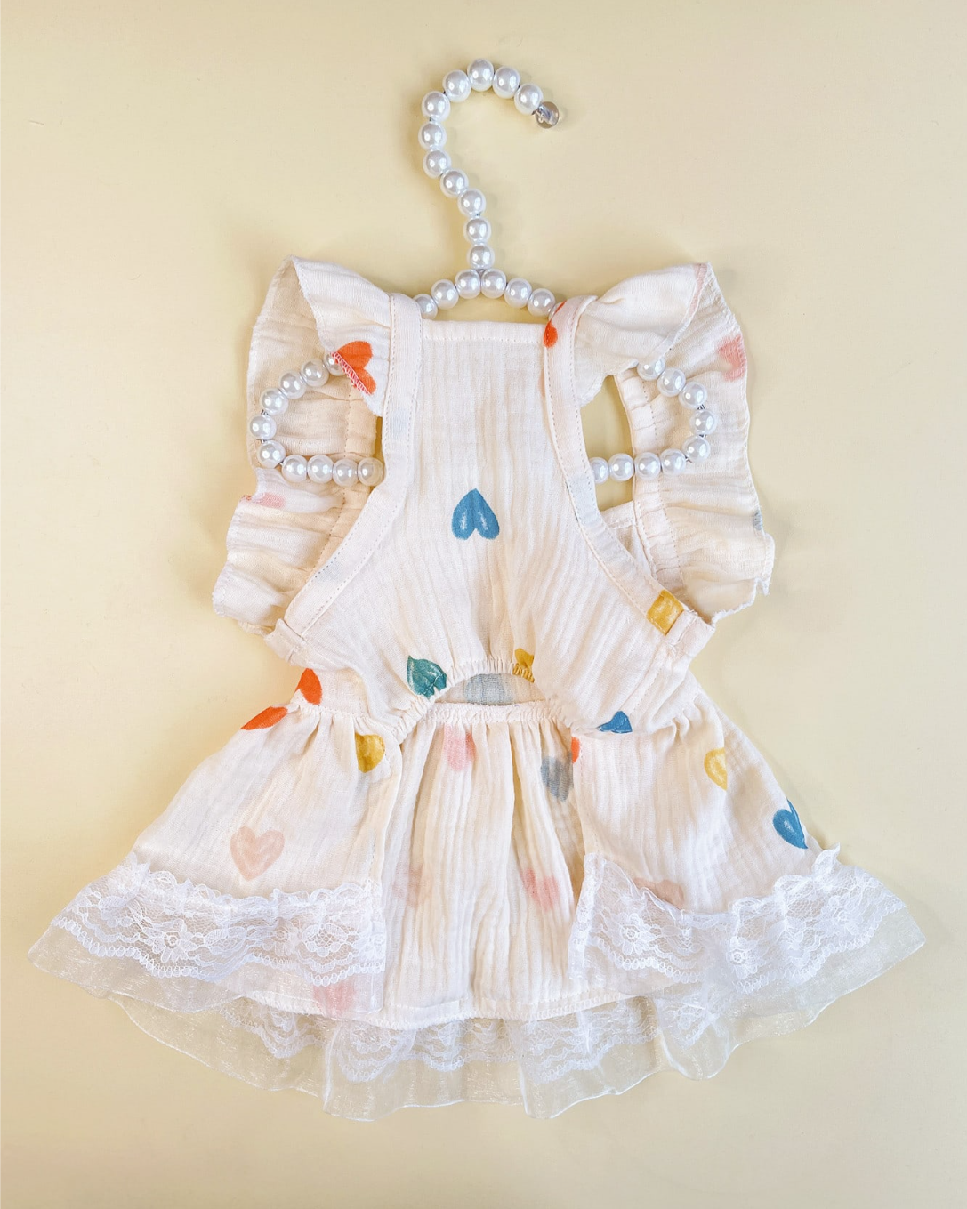 Vestido ligero con estampado de corazones multicolor, fabricado en algodón muselina suave y transpirable. Diseño sin cierres, con vuelos en los hombros y detalle de encaje en el ruedo. Ideal para días cálidos. Apto para perros y gatos.