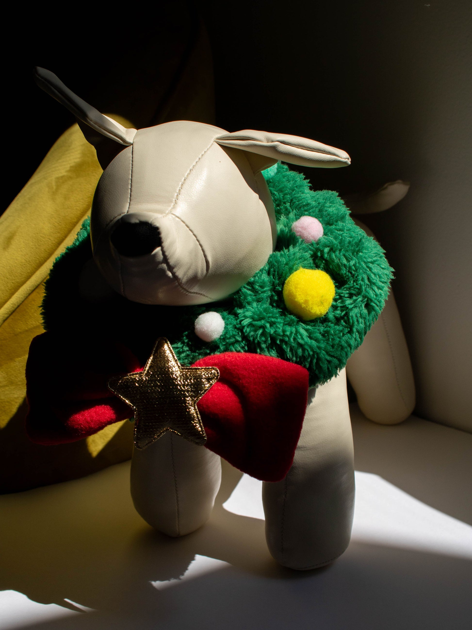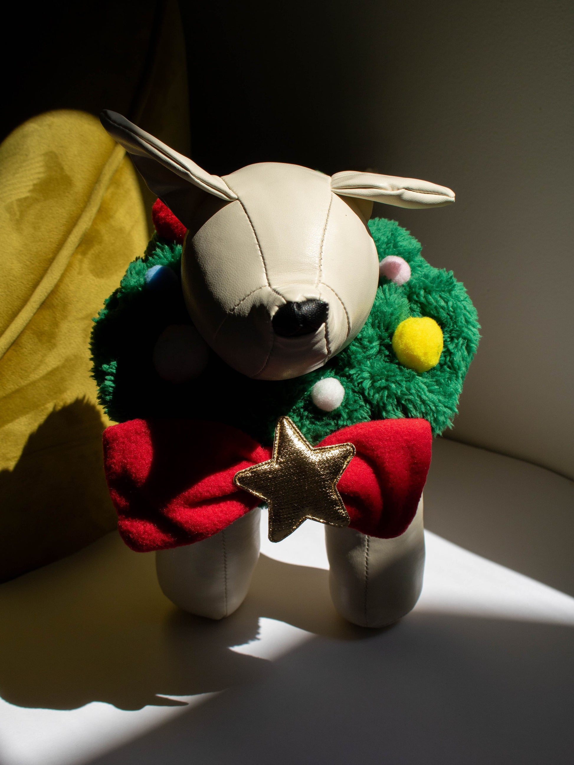 Collar elástico decorativo tipo guirnalda, hecho de felpa verde con pompones de colores, lazo rojo y estrella dorada. Suave, cómodo y lleno de espíritu navideño para celebrar con estilo.