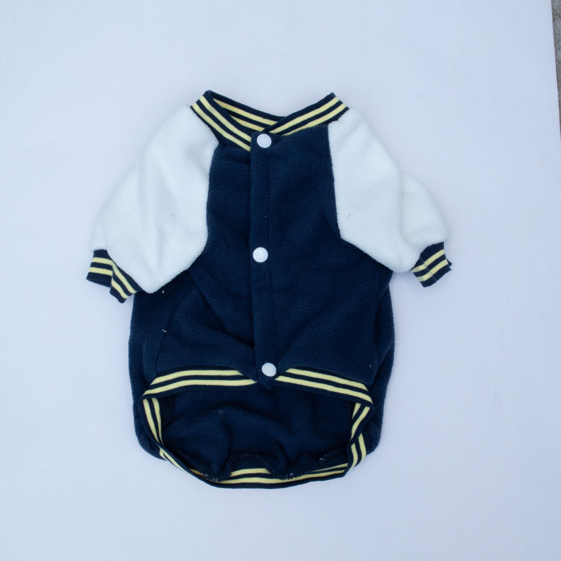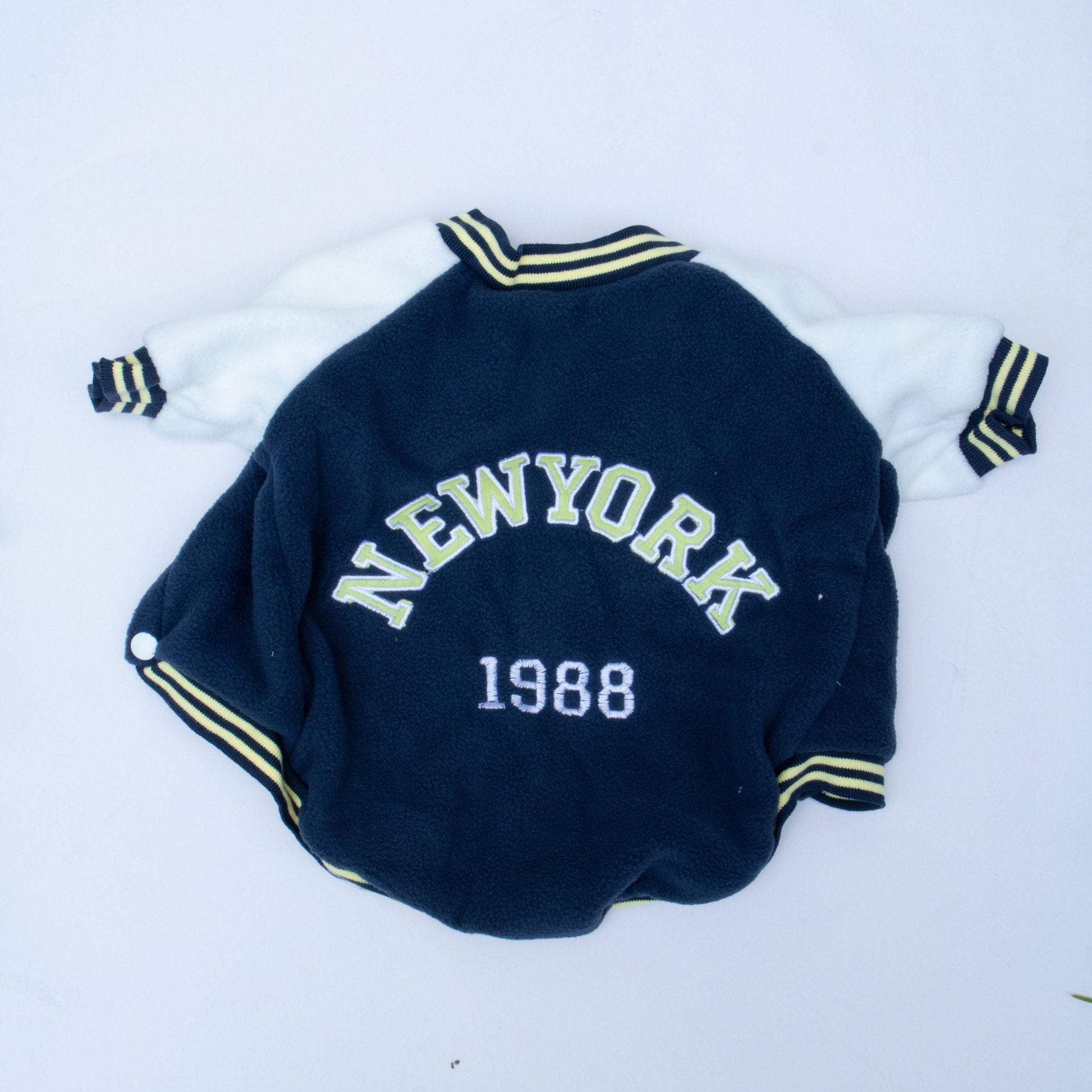Abrigo estilo varsity en color azul marino con mangas blancas y bordado “NEW YORK 1988”. Confeccionado en poliéster suave.