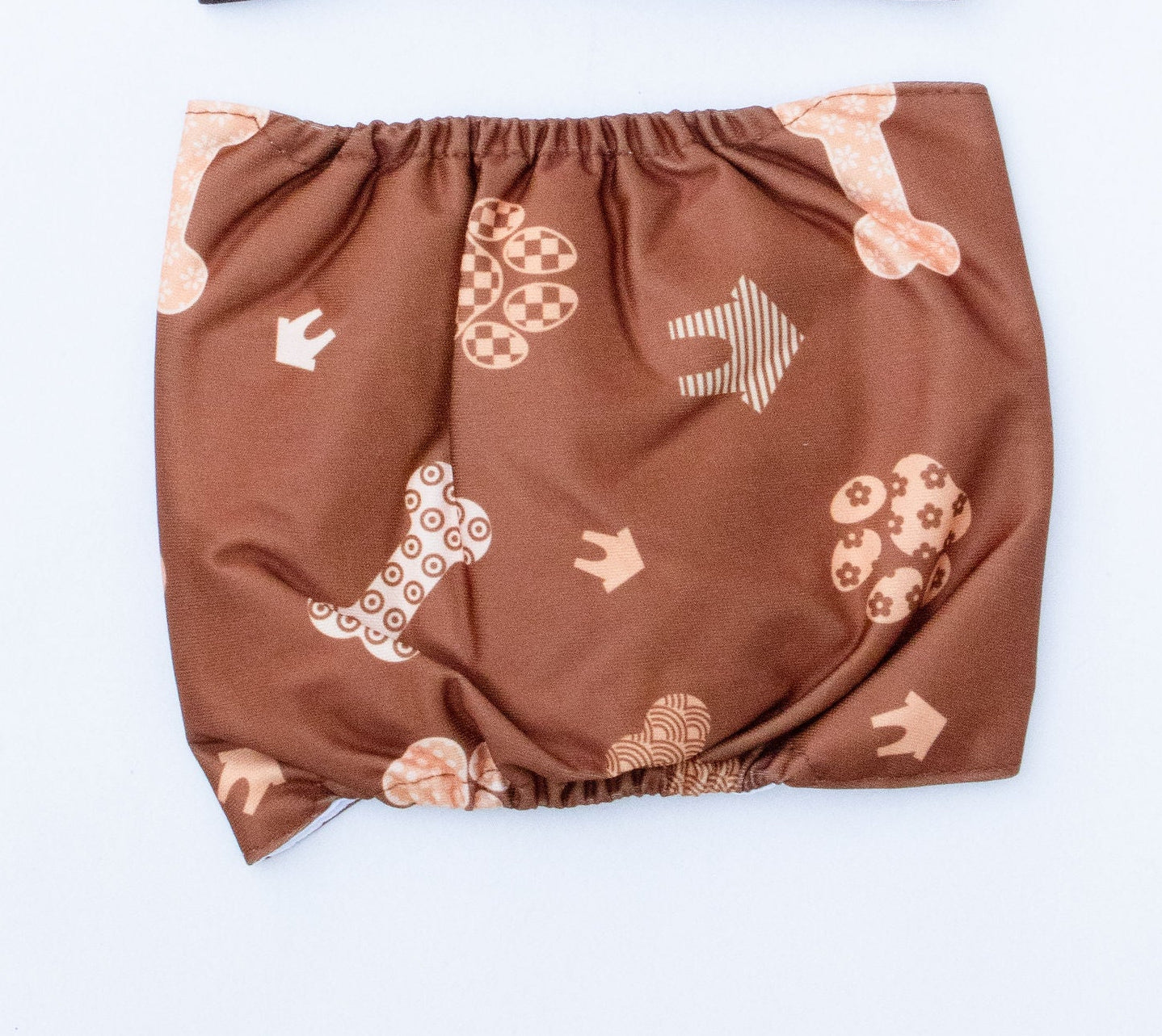 Pañal reutilizable para perro en color marrón claro con diseño de huesitos y huellitas.