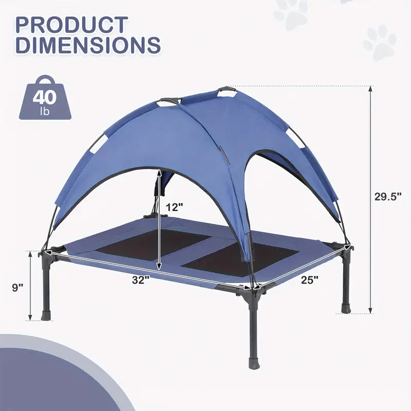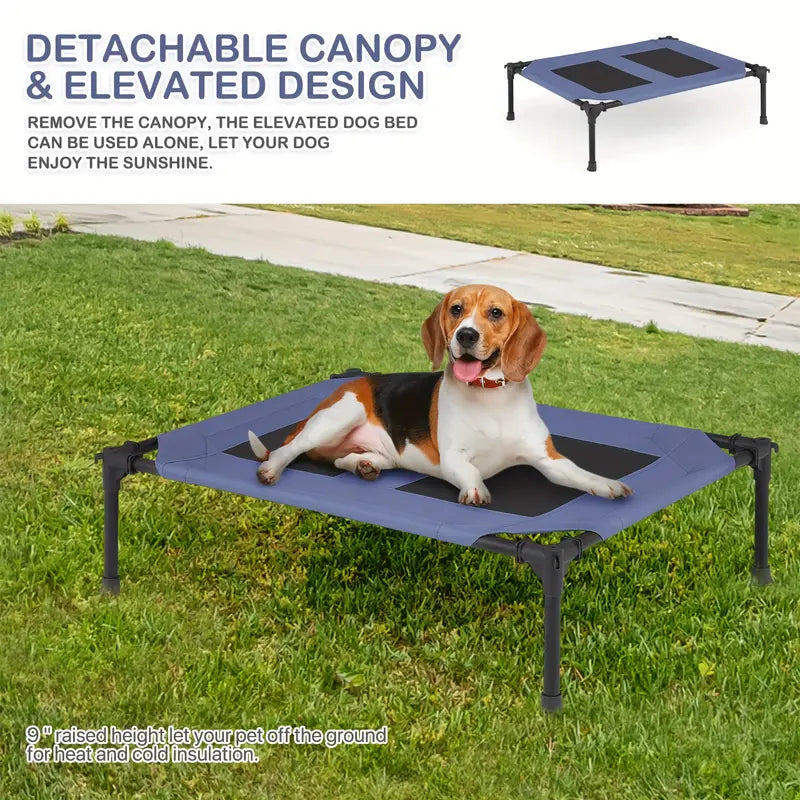 Cama elevada para mascotas con toldo removible que proporciona sombra y ventilación para un descanso más fresco en exteriores. . El techo se puede remover fácilmente, lo que la convierte también en una opción cómoda y práctica para interiores. Su estructura de acero resistente y superficie de malla transpirable ofrecen comodidad, estabilidad y frescura. Ideal para días soleados, playa, jardín o camping. Apta para perros hasta 40 lbs (18 kg).