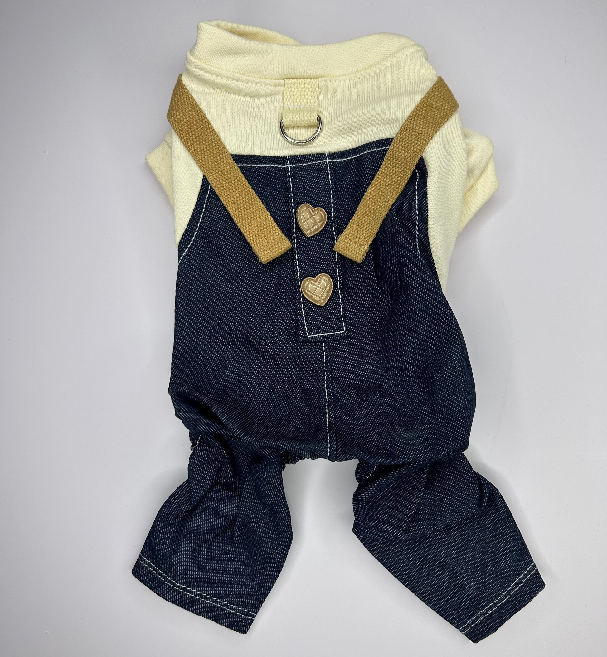 Overol estilo jeans con tirantes y botones de corazón, ideal para perritos con actitud urbana y adorable. Incluye camiseta integrada en tono crema, detalle de anillo para correa y un diseño cómodo y lavable. Perfecto para salidas con estilo.