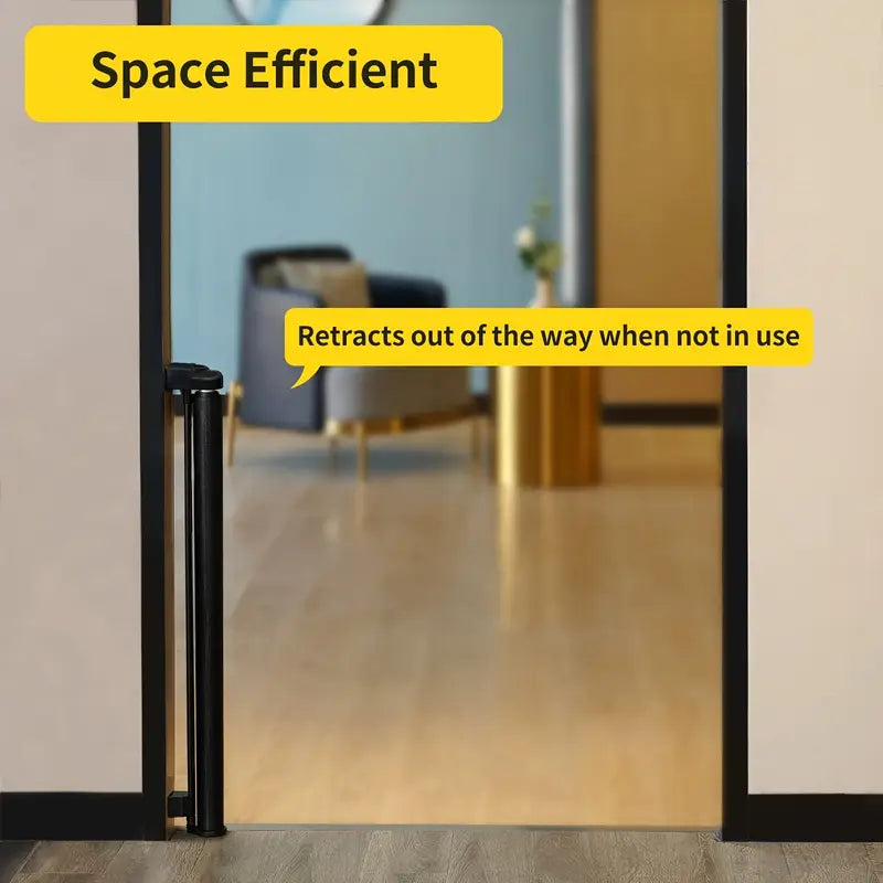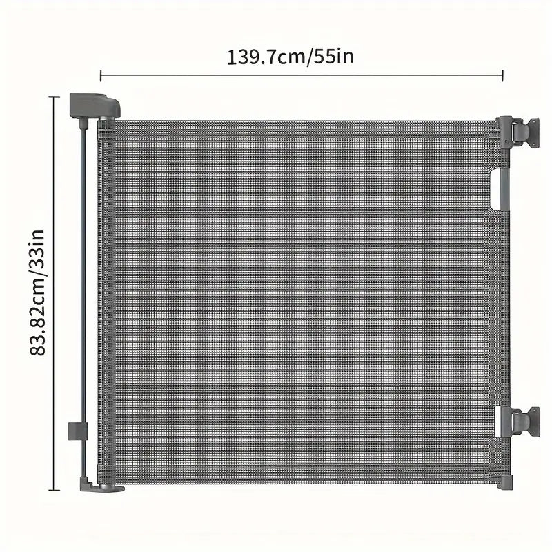 Puerta retráctil de malla resistente de 55 x 33 pulgadas (140 x 84 cm), ideal para delimitar espacios en interiores. Incluye tornillos, soportes y cierres de montaje. Ahorra espacio y es facil de instalar.