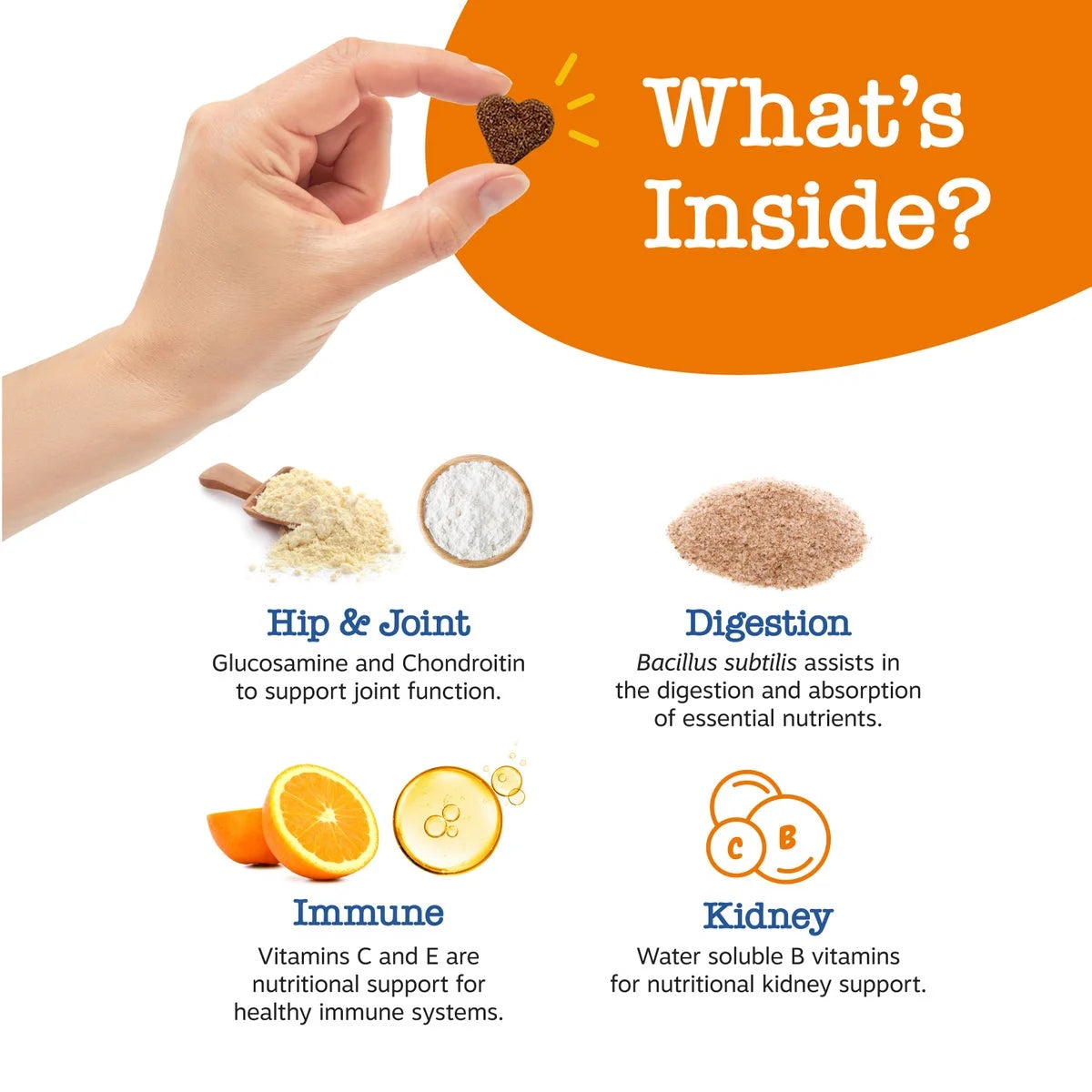 Multivitamínico 11 en 1 para perros mayores. Con glucosamina, probióticos y vitaminas que apoyan articulaciones, digestión, inmunidad y salud general. Suaves bocadillos sabor pollo.