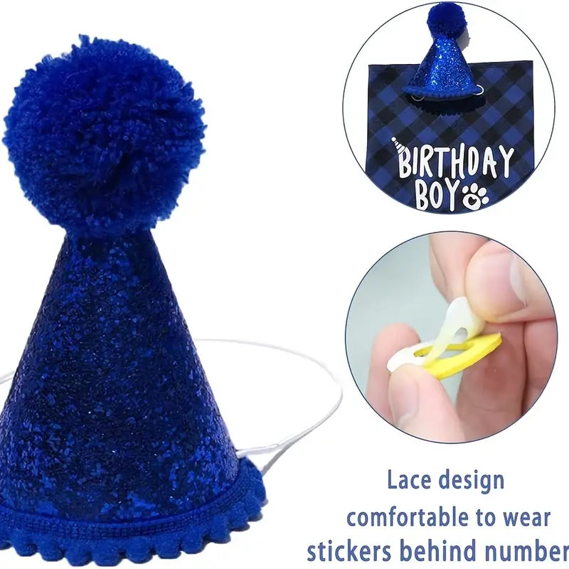 Set de cumpleaños para perro: pañuelo de cuadros azules de poliéster "Birthday Boy", gorro festivo con pompón y números dorados adhesivos para personalizar la edad. ¡Ideal para celebrar el día especial de tu mejor amigo!